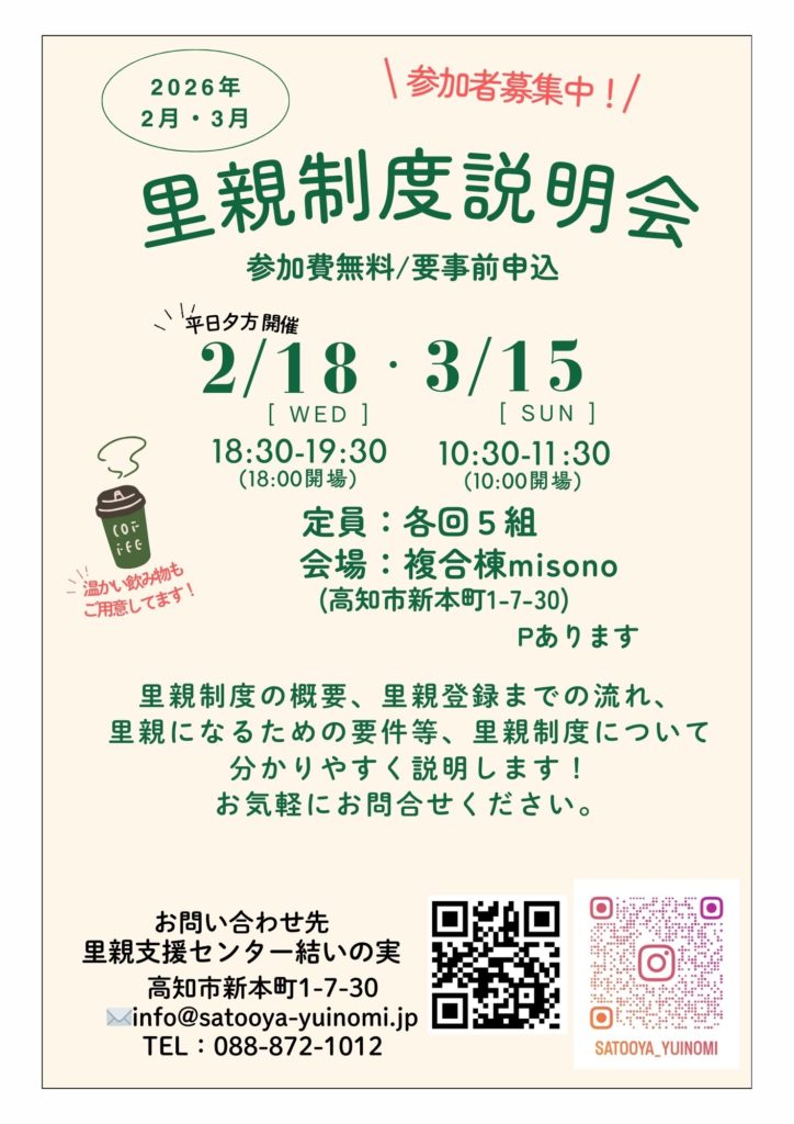 里親登録を検討されている方、里親制度に関心のある方を対象に、2月18日(水)、3/15日(日)、複合棟misono(高知市新本町1-7-30)にて、「里親制度説明会」を開催します。(参加費無料、事前予約制)
